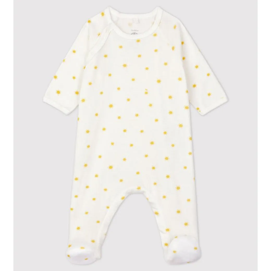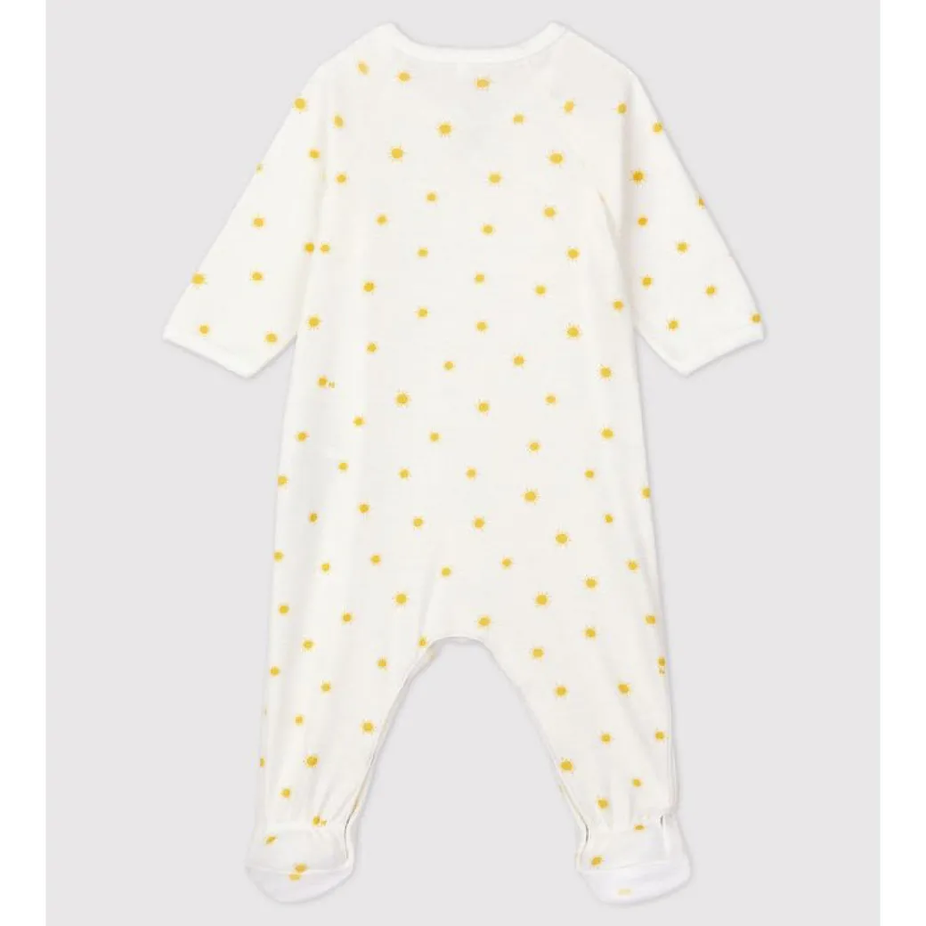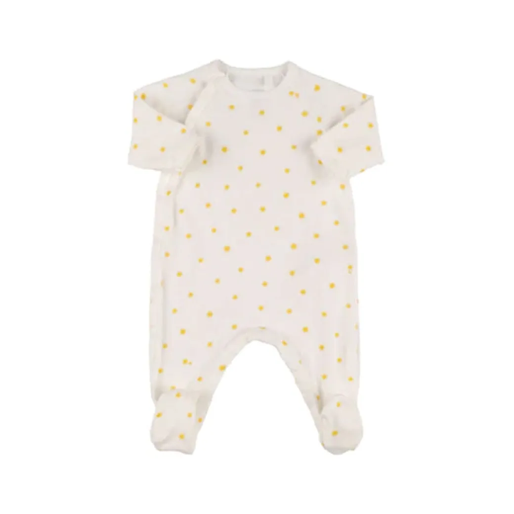 Crossover side snap long sleeve footie with all-over yellow sunshine print.
