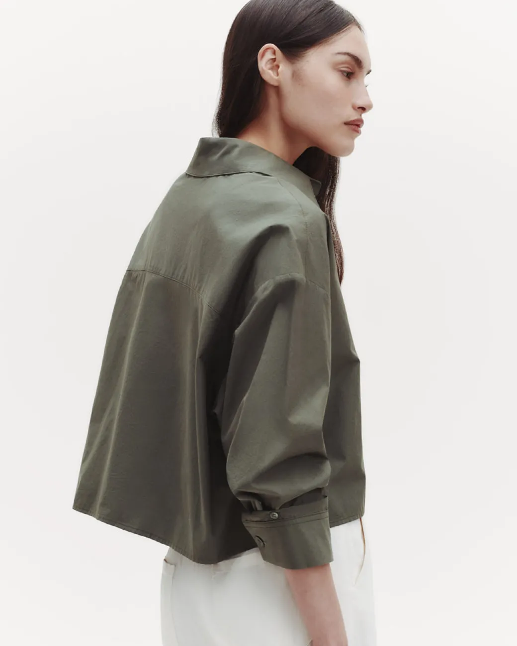 Cropped long-sleeved button-down super-fine Italian cotton shirting. The Soon To Be Ex is a boxy silhouette. Complete with an exposed button up placket, chest patch pocket and single roll button cuffs.