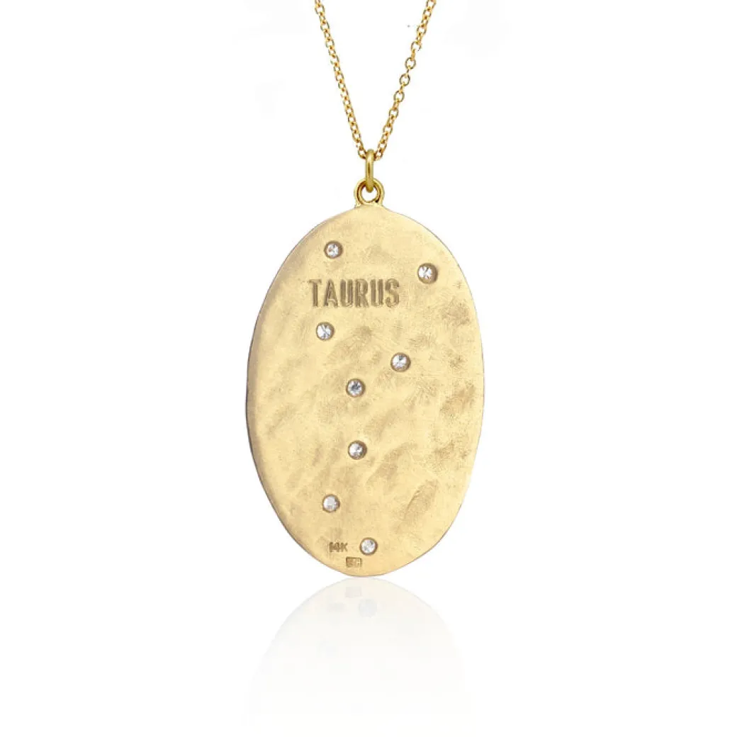 14k brushed gold Astrology necklace with 11 VS1 full cut diamonds in a constellation design and 14k gold chain.