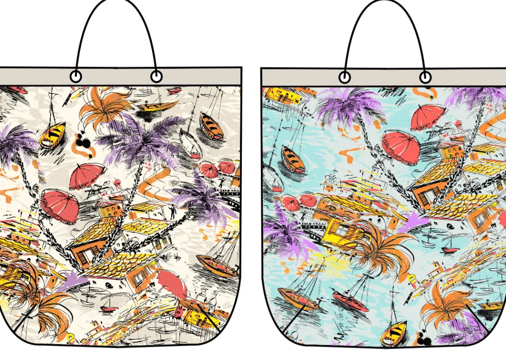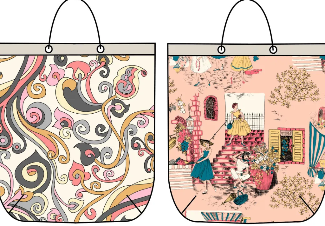 Small bag in silk twill fully lined in cotton, handles in leather cord, exclusive prints “arabesques” and “village”.