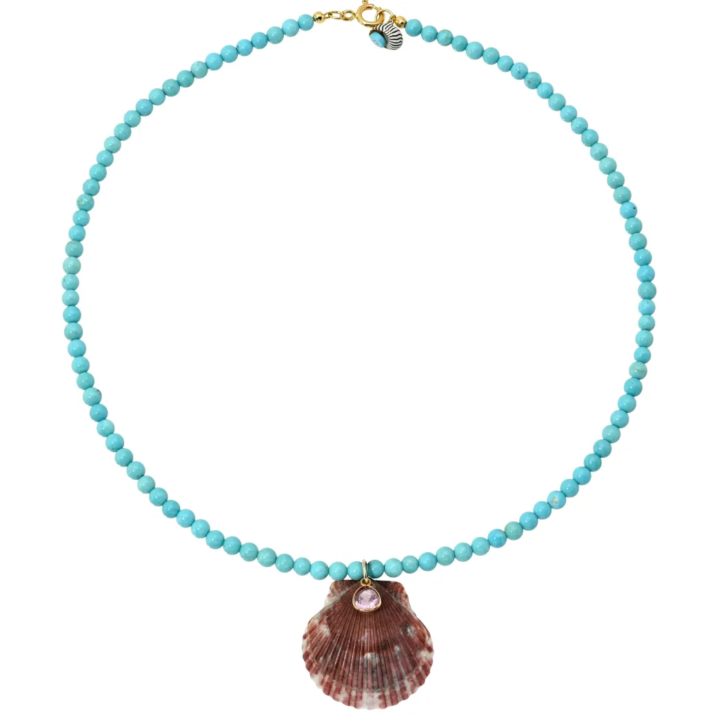 Polished Turquoise Beads with shell and pink Sapphire 14K Gold Necklace