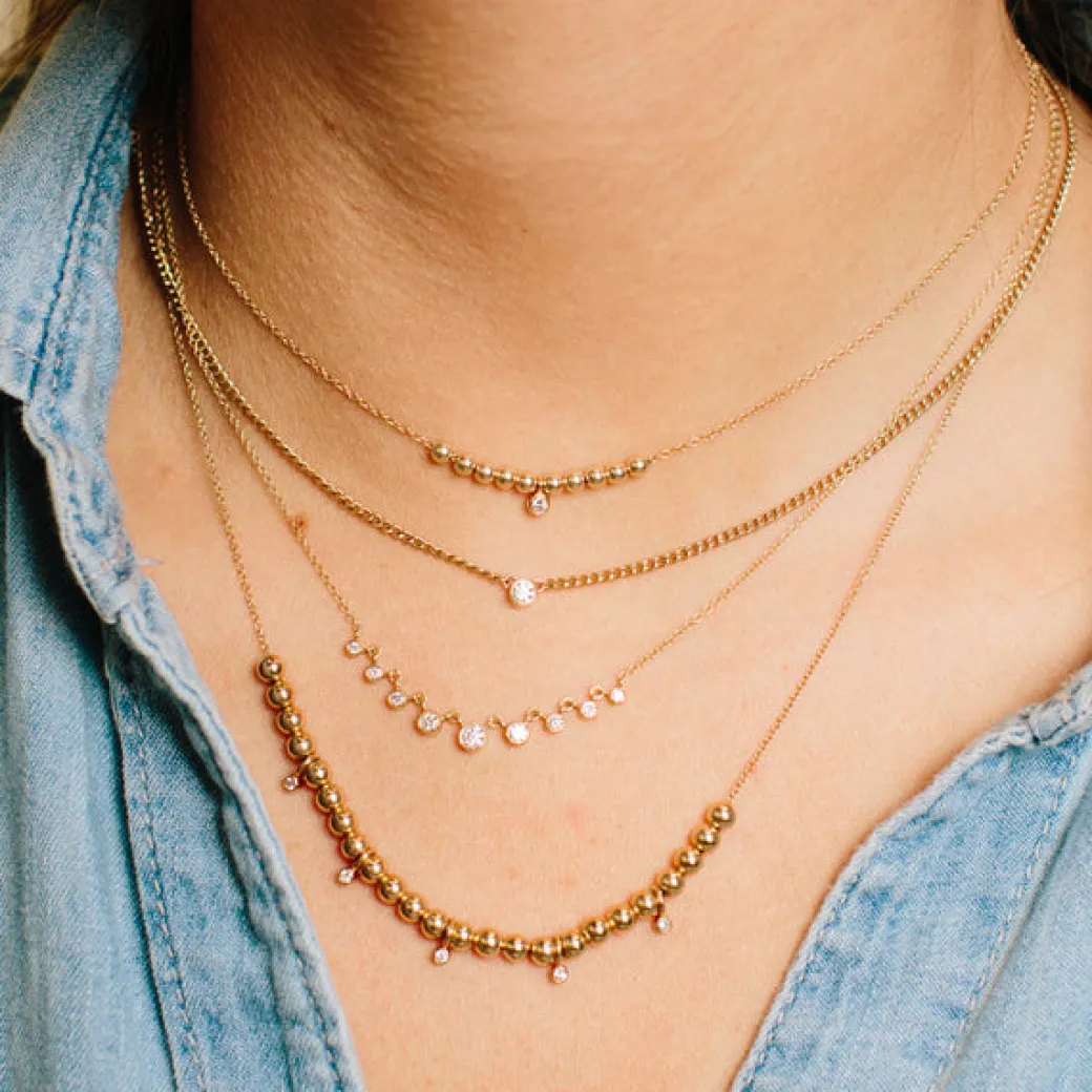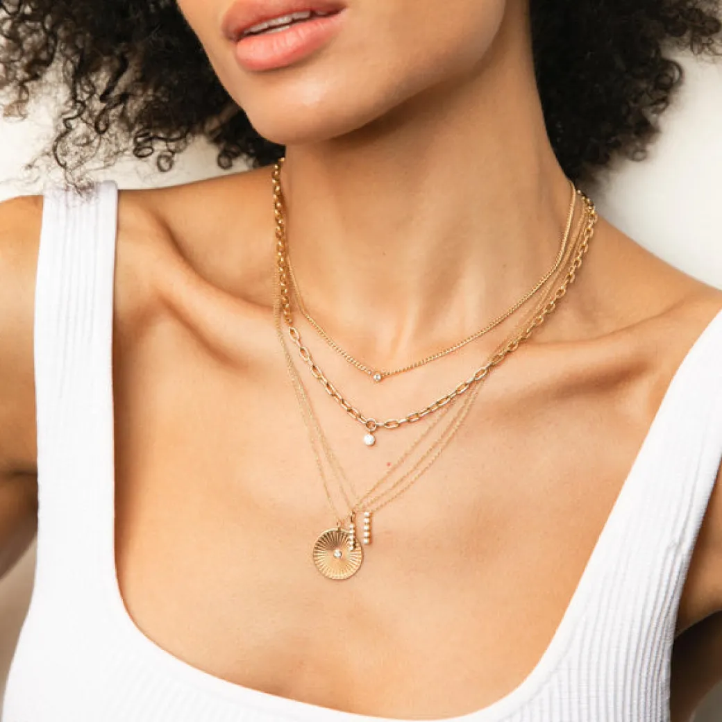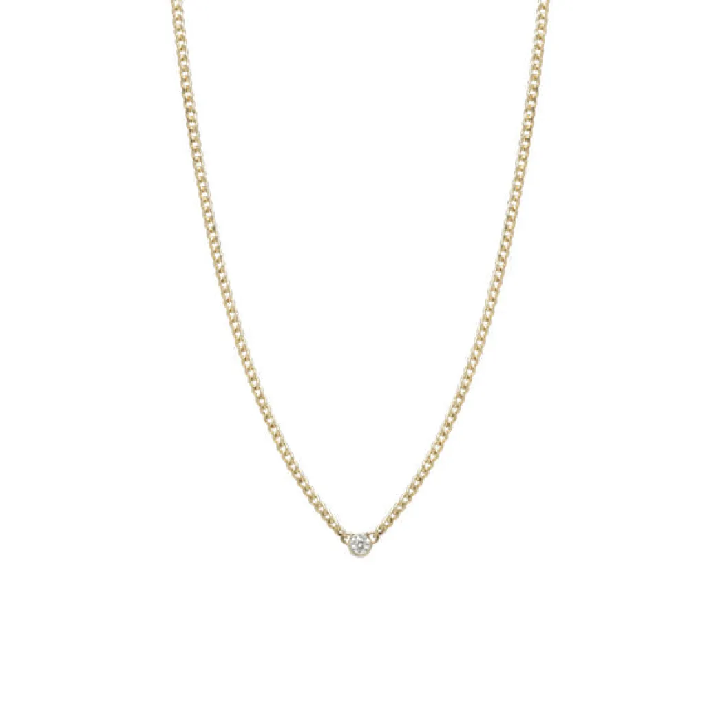 14k gold extra small hollow curb chain necklace with a bezel-set round white diamond.