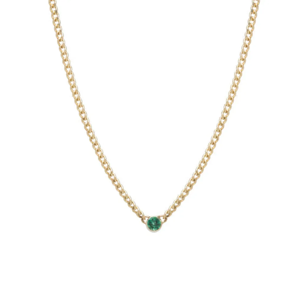 14k gold extra small hollow curb chain necklace with a bezel set round green emerald